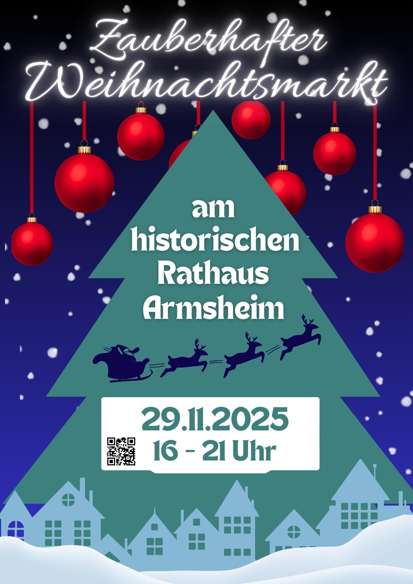 Der Weihnachtsmarkt findet dieses Jahr am 29.11.2025 erstmals am historischen Rathaus Armsheim statt. Der neue Standort bietet eine festliche Atmosphäre, ist barrierefrei und liegt nahe am Spielplatz und sanitären Anlagen.