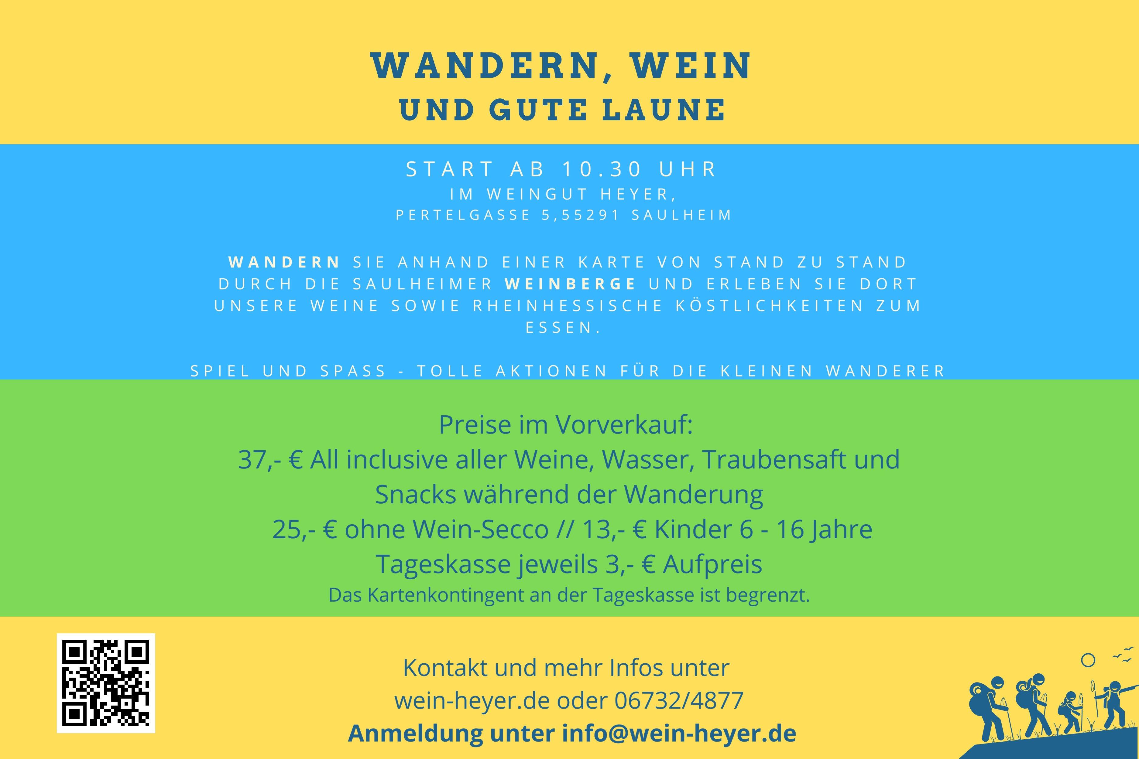 Ab 10.30 Uhr erhalten Sie am 14. Mai Ihr Teilnahmeband, eine Navigationskarte, auf der alle Weinstände in der Saulheimer Gemarkung eingezeichnet sind, sowie Wertmarken, mit denen Sie an jedem Stand etwas zu Essen erhalten. Anhand der Karte können Sie nun alle Stationen frei anlaufen und dort verweilen, so lange Sie möchten. An den einzelnen Stationen erwarten Sie unsere Weine, Secco, Traubensaft und Wasser, sowie eine Kleinigkeit zur Stärkung. Damit die Eltern in aller Ruhe den Tag genießen können, gibt es eine Hüpfburg und tolle Spiele an jeder Station für die kleinen Wanderer.