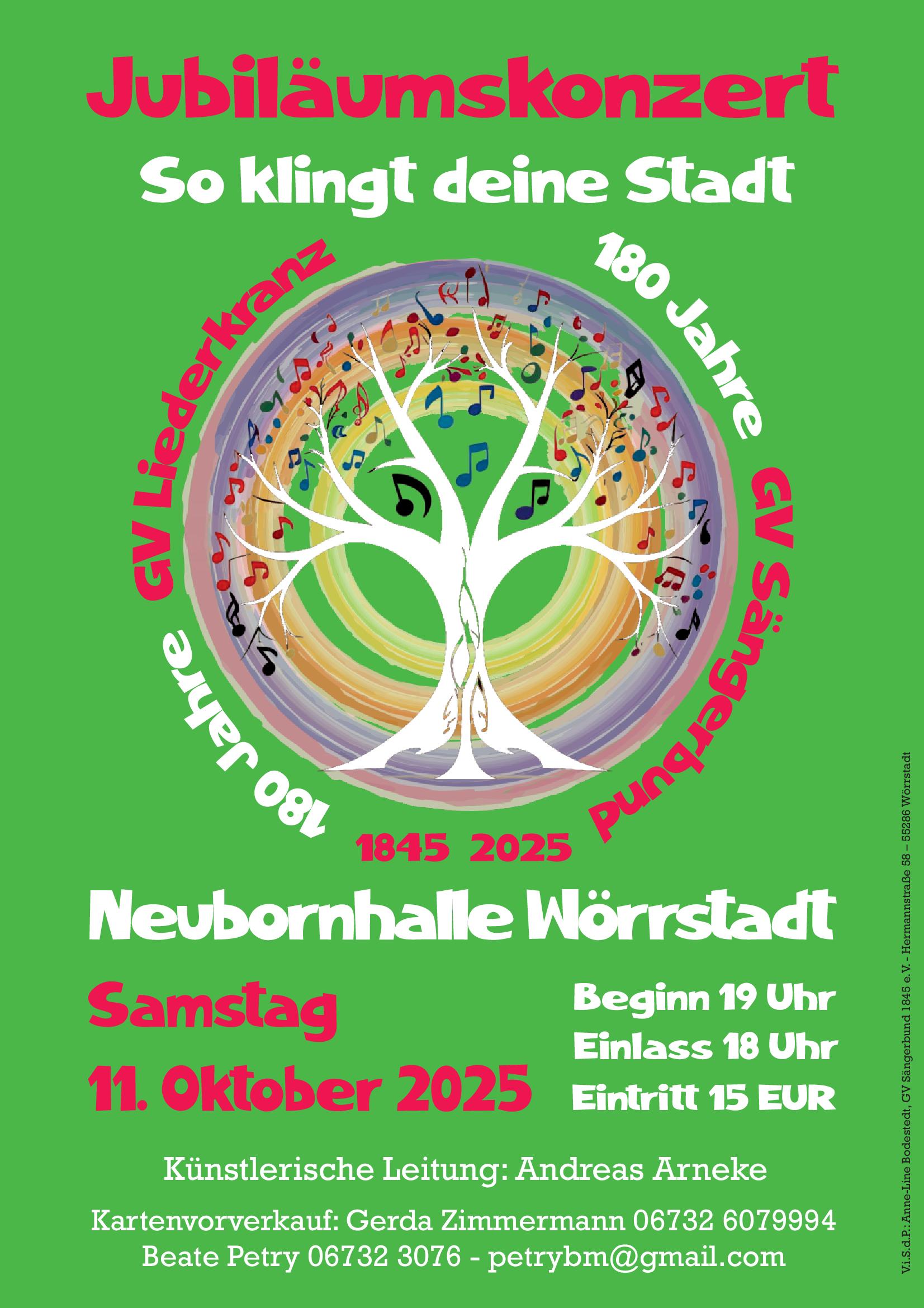 Die Gesangvereine Sängerbund 1845 Wörrstadt e.V. und Liederkranz 1845 e.V. Wörrstadt feiern ihr jeweils 180-jähriges Bestehen mit einem gemeinsamen Jubiläumskonzert in der Neubornhalle Wörrstadt.