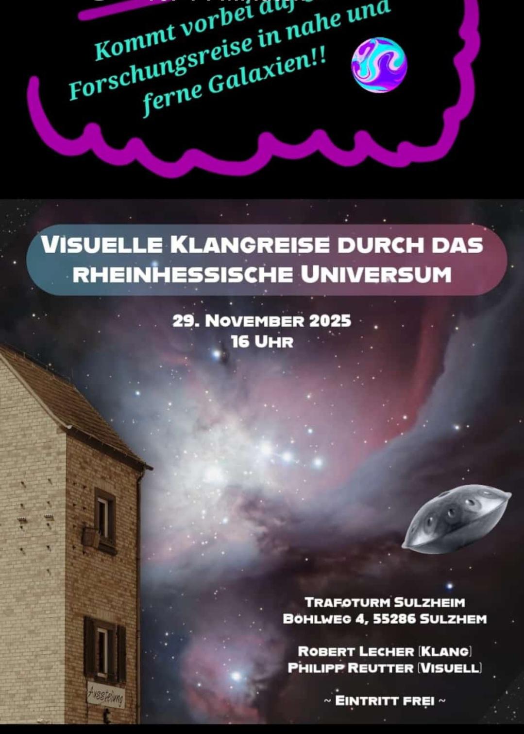 Besucherinnen und Besucher erwartet eine faszinierende Verbindung aus Musik und visueller Kunst – eine Klang- und Bilderreise durch das rheinhessische Universum, die zum Staunen und Träumen einlädt. Eintritt frei!