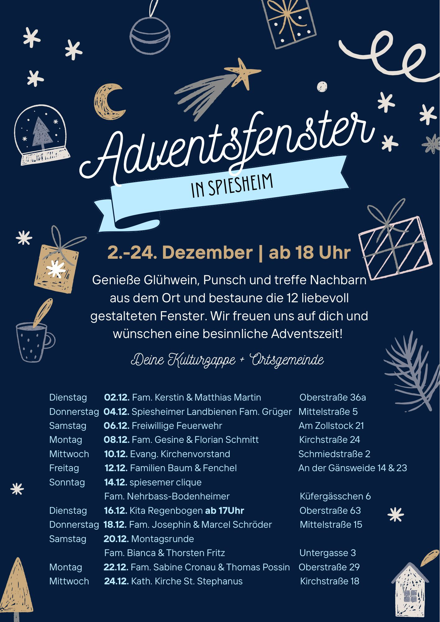 Seit dem Jahr 2000 laden die Spiesheimer Adventsfenster in der Vorweihnachtszeit zu besinnlichen Begegnungen und gemütlichem Beisammensein ein.