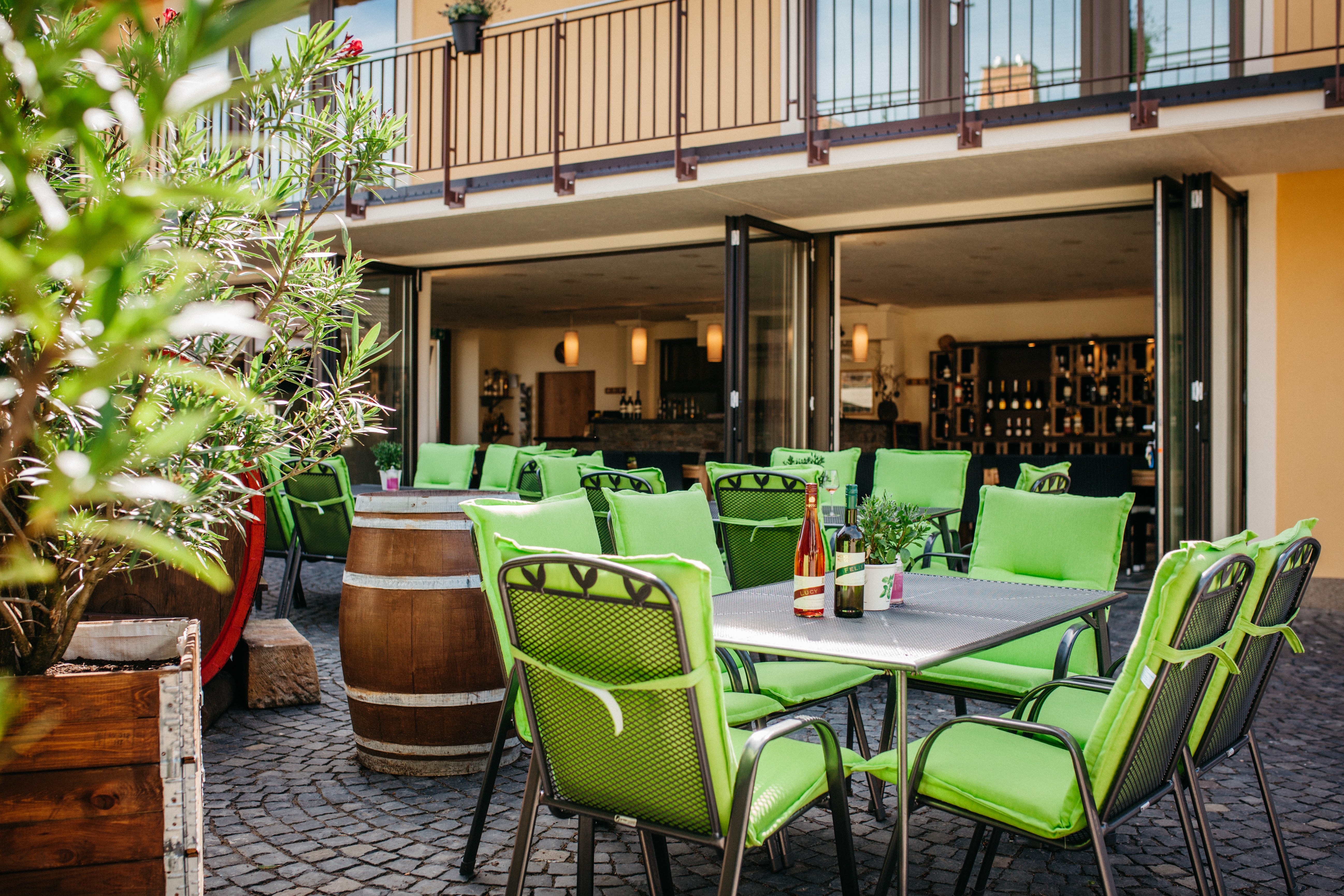 Direkt vor der Vinothek lädt der schöne Terrassenbereich zum Verweilen ein. Dank der großen Glasfront lässt sich der Innenraum komplett öffnen - perfekt für entspannte, laue Sommernächte in besondere Atmosphäre.