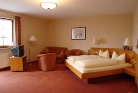 Alle Zimmer sind geschmackvoll eingerichtet und verfügen über Dusche, WC, Kabel-TV und Kühlschrank. Die Ferienwohnung verfügt über eine separate Küche, großes Tageslichtbad, großzügiger Wohn- u. Schlafbereich sowie Balkon (Südseite). Alle Zimmer sind Nichtraucher-Zimmer. Haustiere sind erlaubt, es wird aber eine einmalige Reinigungsgebühr in Höhe von 10,00 € erhoben.